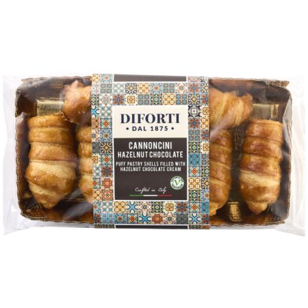 One of the most delicious treats from Sicily, cannoncini are puff pastries in the shape of a horn, often with a rich filling – here, filled with a luscious hazelnut chocolate cream. Indulge in this authentic Italian food delicacy with family and friends over a cup of coffee or tea. These pastries DO NOT require refrigeration. Once opened, please keep in a sealed container and they will keep fresh for up to 1 week.