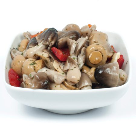 Marinated mixed mushrooms with red peppers and herbs. There are many varieties of edible mushroom, all different. We have chosen three types of mushroom to produce what we think is the best combination in terms of taste, texture and appearance. We have accented their delicate, earthy flavour with chopped red peppers and herbs. Inspired.