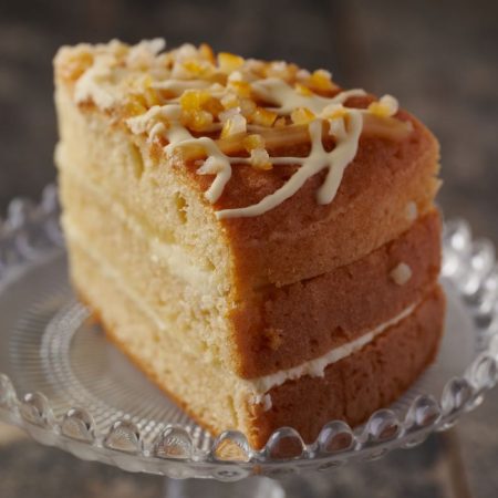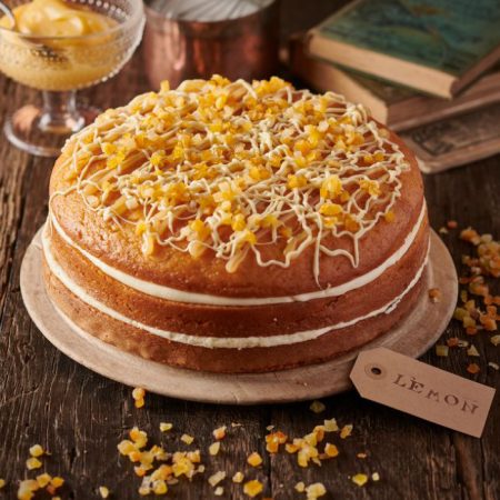 Freshly bakes Lemon Curd Drizzle Cake finished with Citrus peel