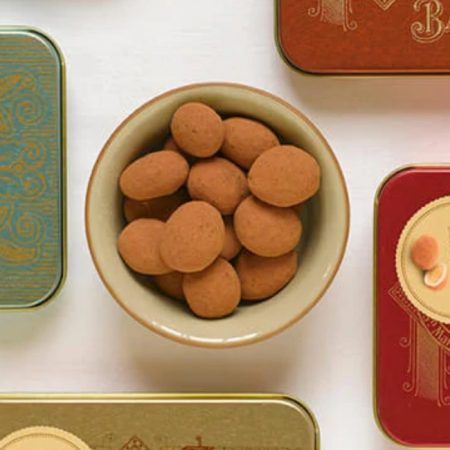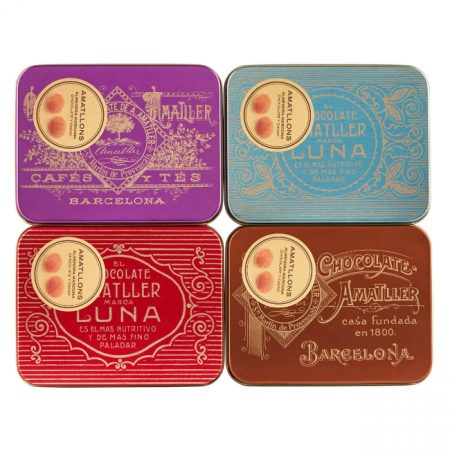 Toasted and caramelised Marcona almonds coated in white chocolate, then dusted in pure cocoa powder. The beautiful vintage tin uses a design from their 1901 range. At first, pure cocoa powder gives a bitter taste which is then offset by the sweet, creamy taste of the white chocolate in a combination that is enriched by the caramelized notes and crunchy texture of the whole Marcona Almonds. Great combination of aroma, flavour and texture.