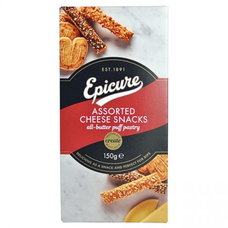 14 x 150g cartonAll-butter puff pastry Assorted Cheese Snacks are baked to a light crispy perfection. Made with creamy gouda and mild tangy edam cheese. A perfect snack straight from the box and great for parties. Try serving with our classic artichoke spinach dip.