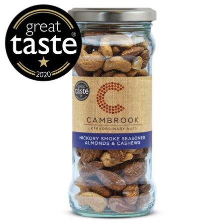 Baked almonds and cashews tumbled in a seasoning derived from the smoking of hickory wood