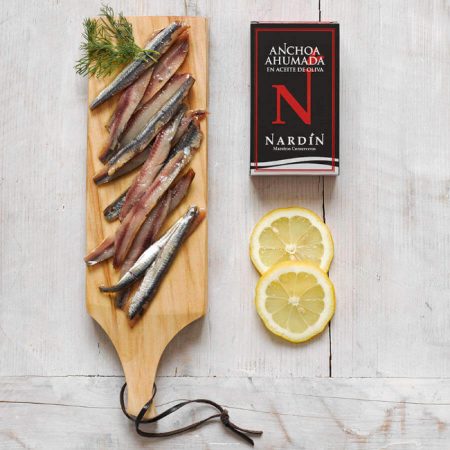 12 x 100g tinsConservas Nardin only buys anchovies caught in the Cantabrian Sea; the fish destined to be used for their smoked anchovies are brined, rather than salted, and then cold smoked whole over beechwood before being filleted and then tinned in olive oil. They are tender and moist, mildly fishy and lightly smoky, truly delicious.