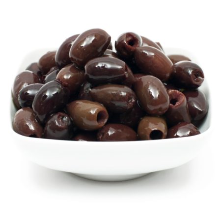 Pitted Kalamata Olives. The quintessential Greek black olive with a smooth, meaty texture and a savoury, bitter flavour.
