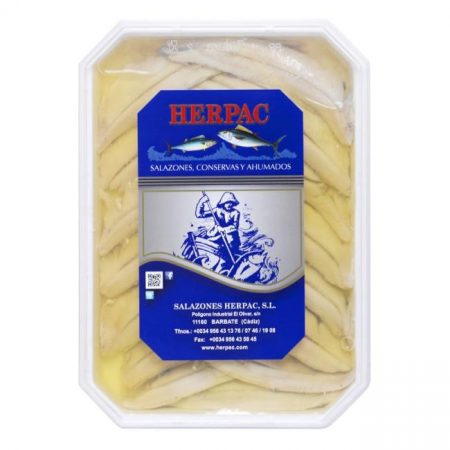 1 x 550g traysHerpac buys high quality anchovies fished in the eastern Atlantic which are processed in their factory Barbate, Cádiz. The fish are first marinated in white wine vinegar, which will give the boquerones their distinctive white colour, before being packed in sunflower oil whose mildness allows the flavour of the fish to come through. This product has been awarded with 1 star in the Great Taste Awards 2016. The judges’ comments were: “Plump and generous anchovies, a good balance of sweet and acidic, very pleasant. How lovely to see white anchovies rather than the usual dark ones. They have zing and vigour. The texture is firm and meaty.”