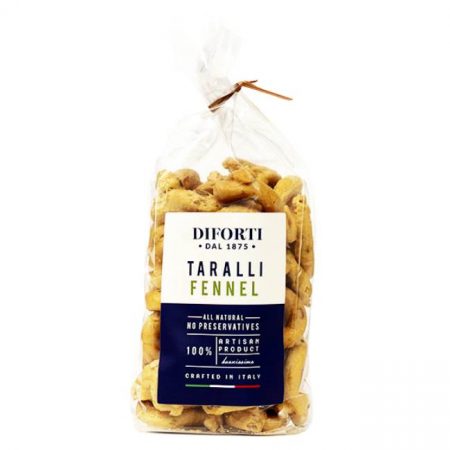 15 x 200g packetsTaralli are an authentic Italian snack food, with a similar texture to grissini, made from top-quality 00 flour, yeast, salt and extra virgin olive oil. Each of Diforti’s Fennel Seed Taralli is handmade and enhanced with the finest-quality fennel seeds. This Italian snack is the ideal party food and goes well with cold drinks but also makes a great addition to antipasto platters and dips.
