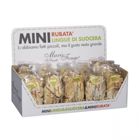 20 x 100g displayMini Mother-in-law’s tongues® traditional flavour. The unique original version, just flour, water, salt, yeast and the best organic extra virgin olive oil, entirely produced in Italy, artfully blended to obtain an unmistakable flavour.