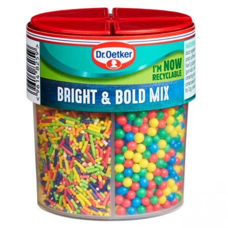 4 x 109g potsDr. Oetker Bright & Bold Sprinkle Mix is a 4 cell sprinkle set offering a variety of fun colours that can be sprinkled into cake mix, used to decorate cupcakes or even splashed over ice cream and jelly at parties. Great for adding a colourful addition to the bake, they’re great for using when baking with the kids. Ready to eat: Great sprinkled on cupcakes, ice cream and desserts. Apply to buttercream and icing just before it sets or onto desserts and ice cream before serving.