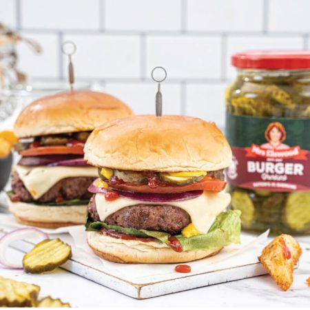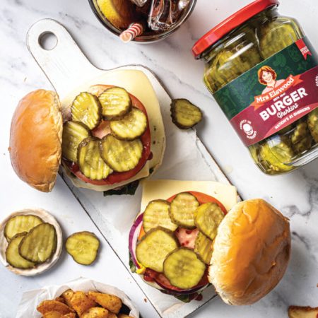 Burger Slices pickled cucumber. Guaranteeing premium quality for over 70 years, Mrs Elswood pickled cucumbers are harvested at the height of the cucumber growing season during June and July every year. Cucumbers are hand-selected for their shape and size before being pickled, packed and delivered, direct from the grower, to maintain freshness and full flavour. The unique flavour and seasonality of Mrs Elswood’s kosher pickled cucumbers makes them a store cupboard essential! Perfect addition to a classic burger, bringing crunch and a delicious taste.