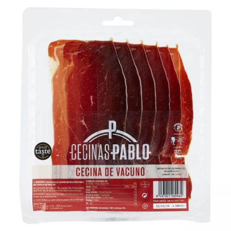 25 x 100g packetsCecina is a traditional product that has been made in the north of Castile and Leon for many hundreds of years. The best is reckoned to come from Astorga, where the quality of the cattle, high altitude and cold, dry winters provide the perfect conditions for its production. Rich, and deep flavoured with a hint of iron and a distinct flavour from the natural smoking process. This product has been awarded with 1 star in the Great Taste Awards 2016. The judges’ comments were: “Deep, rich, attractive colour on these very lean thin slices. Very subtle smoky overtone on rich, sweet tasting beef which is so tender it melts on the tongue. A good moisture level, rich and with complex flavours from the natural smoking, the iron comes through well.”