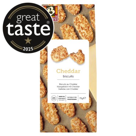 8 x 75g cartonFully cured Cheddar is a hard cheese, shaped like a drum, varying from white to pale yellow in colour. The more mature, the sharper the taste of Cheddar, but it never gets overwhelming. It finds it origin in Somerset, England. Good Cheddar is firm and slightly crumbly in texture, yet mellow in character. The cheddar gives these biscuits a bit of earthiness with hints of hazelnut.