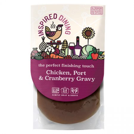 Water, Chicken Stock (6.5%) (Chicken, Yeast Extract, Salt, Chicken Fat, Vegetable Powders (Leak, Onion), Sugar, Lemon Juice Concentrate, Black Pepper, Sage Oil), Cornflour, Cranberry Sauce (3.2%) (Cranberries, Sugar, Water), White Wine (Contains Sulphites), Onion, Port (1.5%)(Contains Sulphites), Rapeseed Oil, Sugar, Vegetable Stock [Dried Vegetables (Potato, Onion, Leek, Celery), Carrot Concentrate, Sugar, Sunflower Oil, Lemon Juice Concentrate], Lemon Juice Concentrate, Yeast Extract
