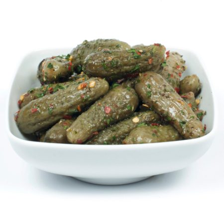 Marinated mini gherkins with herbs. Perfect in Antipasti, sandwiches and salads, our lightly spiced mini gherkins add a deliciously crunchy and piquant accent to any meal.
