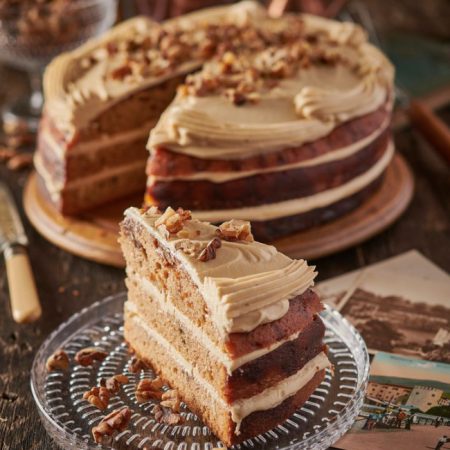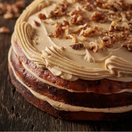 Freshly bakes espresso coffee & walnut cake made with samba bean coffee