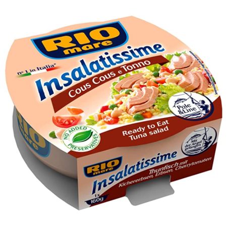 18 x 160g potsThe unique flavour of Rio Mare tuna expertly combined with delicate couscous and other fragrant vegetables. Ready to eat any time thanks to the stay-fresh packaging – with no added preservatives. This couscous salad is perfect for anyone who enjoys surprising flavours – the sweet and exotic flavour of couscous paired with delicious tuna and appetising vegetables, expertly combined in the best Mediterranean tradition.