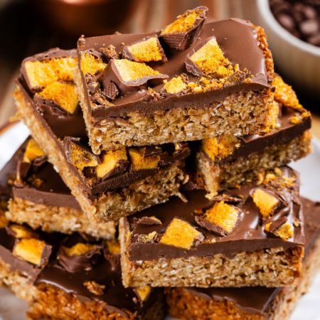 All butter flapjack topped with milk chocolate and crunchie pieces GF