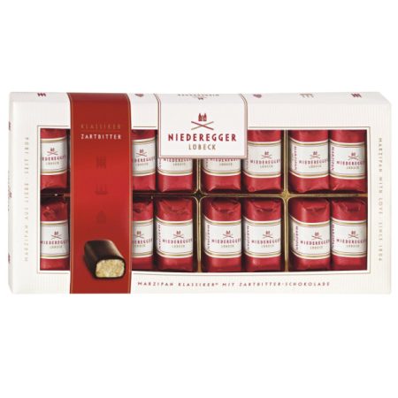 Fine marzipan covered in crunchy dark chocolate in appetizing bites.