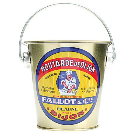 Dijon Mustard in Metal Gift Bucket. It’s in the town of Beaune that “La Moutarderie Fallot” manufactures exceptional mustard using traditional family know-how passed down from generation to generation since 1840. Crushing the seeds with a millstone is what keeps all the flavoursome qualities in Fallot mustards. Metal bucket contains one jar of Fallot Dijon Mustard 450g.