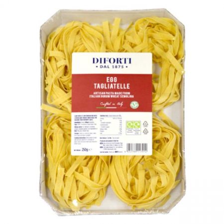 12 x 250g traysThis Diforti egg pasta is specially made by artisans using the finest ingredients and production methods that give the pasta a very coarse texture. This is what give the pasta its distinctive appearance and make it easier for the pasta to hold onto as much sauce as possible.