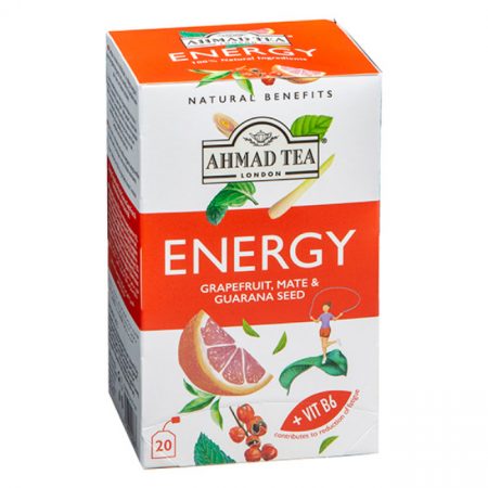 6 x 20 boxesSometimes we need a little help getting from sleepy to sprightly. ahmads Energy Infusion has been created to help you do just that. A bold blend of caffeine-rich mate, mint, grapefruit and lemongrass – it makes for a truly invigorating cuppa. Give yourself a naturally uplifting boost on sluggish days with this ‘get-up-and-go’ fruit and herb tea.