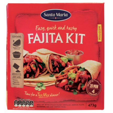 Soft tortillas, flavoursome seasoning and tasty tomato salsa for creating fajitas. The kit contains 8 Plain Flour Soft Tortillas, Fajita Seasoning Mix Medium and Medium Salsa. Just add 500g chicken, 1 onion and 2 peppers. Feeds 4 in 20 minutes.