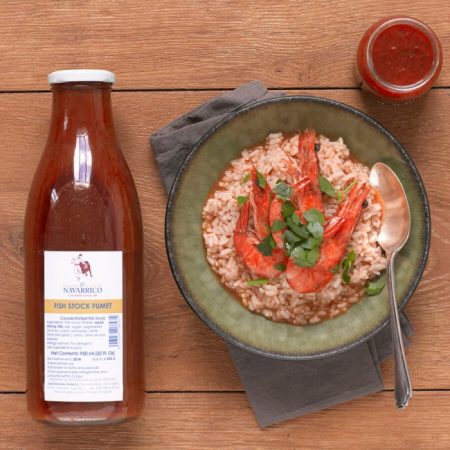 A concentrated fish stock made with fish, shrimp, squid, onion, garlic, tomato, carrot, leek, olive oil, wine, pepper and sugar. Perfect for making paella, fish soup or seafood stew. Shake well before use and add water and salt to taste.