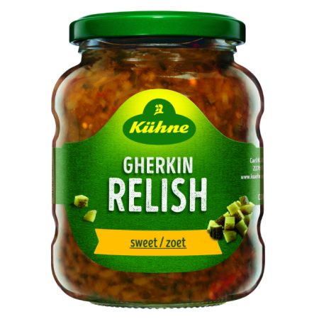 6 x 350g jarsSweet pickle relish with crunchy gherkin cubes and pieces of paprika. Complements meat dishes, sandwiches or hot dogs.