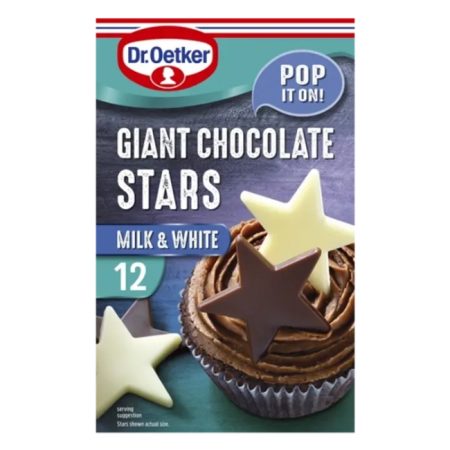 Everyone loves chocolate, and these Dr. Oetker Chocolate Star decorations are perfect for adding to any bakes. Each pack contains 10 milk and white chocolate stars. These giant chocolate stars are easy to use and ideal for baking with kids and creating a stylish finish. Each pack contains 6 white and 6 milk chocolate stars.