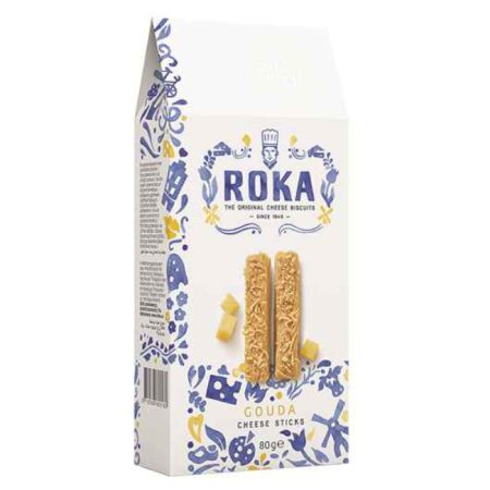 12 x 80g cartonThese cheese biscuits are made to the original recipe from 1949, by the Dutch patissier Jo Roodenrijs, the founder of ROKA. They are made with refined puff-pastry (90 layers), 30% carefully matured old Gouda cheese and other high-quality ingredients, offering an intense and dominant cheese taste that melts on the tongue.