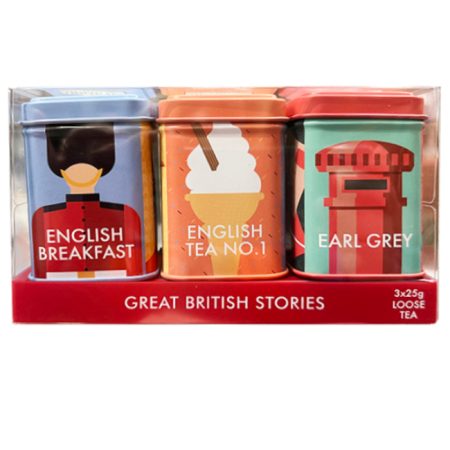 12 x 3 x 25g acetateEnglish Breakfast, English Tea No. 1 and Earl Grey loose leaf tea in three gift tins.