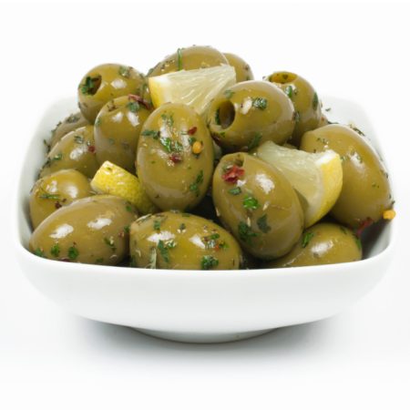 Marinated large green pitted olives with lemon and herbs. Mouth-wateringly fresh, lively and succulent, this recipe partners the best selected giant green olives with the sparkling citrus flavours of sun-ripened Sicilian lemons.