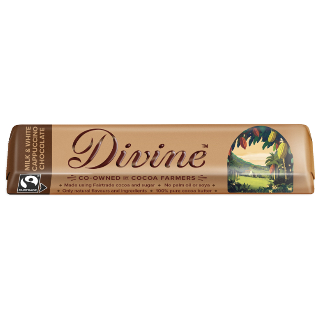 Made with the finest Fairtrade cocoa beans from Ghana and only ever using natural flavours and ingredients, every bar directly improves the lives of farmers and their families. Dual layers of creamy white and milk chocolate fleckled with intense coffee pieces.