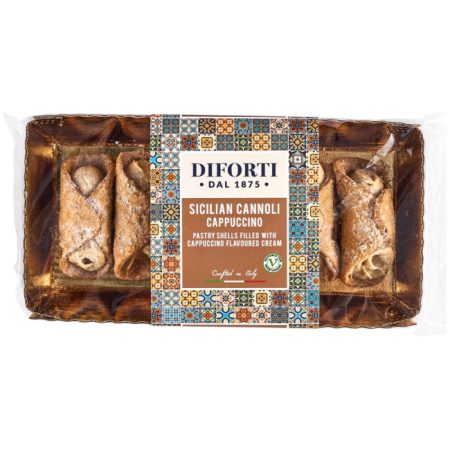 Cannoli are Sicily’s signature pastry – delicious and crispy, the dough is rolled into the characteristic tube and fried, originally filled with fresh ricotta candied fruits and pistachio, but now with a wide range of flavoured cream fillings. Finally they are dusted with icing sugar and are ready to eat. Perfect as an indulgent treat with an espresso, a cappuccino or a cup of tea if you prefer. These pastries DO NOT require refrigeration. Once opened, please keep in a sealed container and they will keep fresh for up to 1 week.