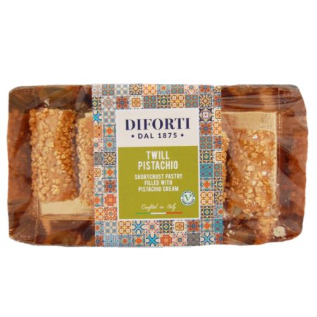Tubes of shortcrust pastry decorated with puffed rice and filled with velvety smooth pistachio cream.