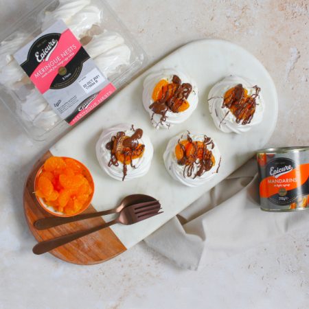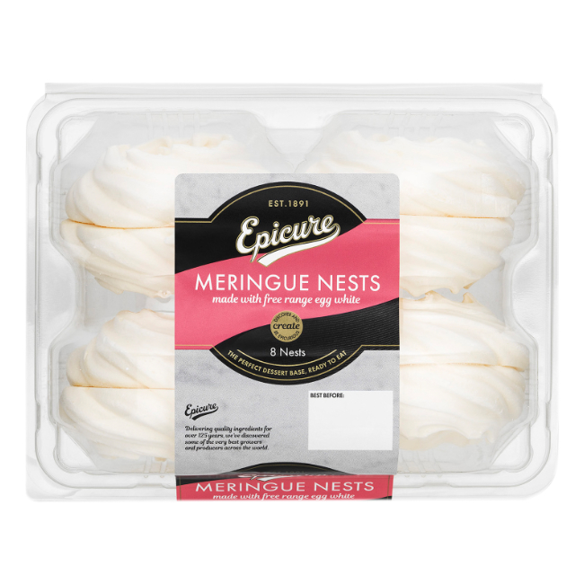 8 meringue nests, made with free range egg whites, ready to be loaded up with cream, strawberries, raspberries and passion fruit for a delicious summer dessert.