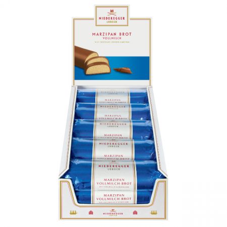 Niederegger Marzipan comes from the Hanseatic City of Lubeck in Germany, the home of marzipan. They make their marzipan with 58% pure Mediterranean almonds; this is the highest quality marzipan possible. Here, enrobed in smooth milk chocolate.