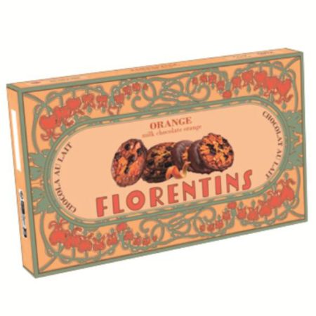 24% Milk Chocolate (35% Cocoa), 16% Candied Orange Cubes, 11% Sliced Almonds, 3% Honey, Sugar, Raisins, Fresh Butter, Fresh Cream, Guérande Salt