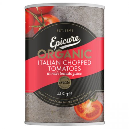 12 x 411g tinsEpicure organic Chopped Tomatoes are gently ripened under the Italian sun. These sweet, chunky tomatoes are so versatile. Perfect for making delicious thick tomato-based sauces.