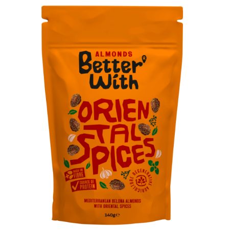 Oriental Spices flavoured almonds are natural, gluten-free, crunchy and versatile. With an oriental touch and the taste of Mediterranean almonds, Better With Oriental Spices are here to bring all the flavours and secrets of the East to the West. They are a unique blend of sweet and spicy, carefully crafted to bring the essence of oriental spices to these almonds.