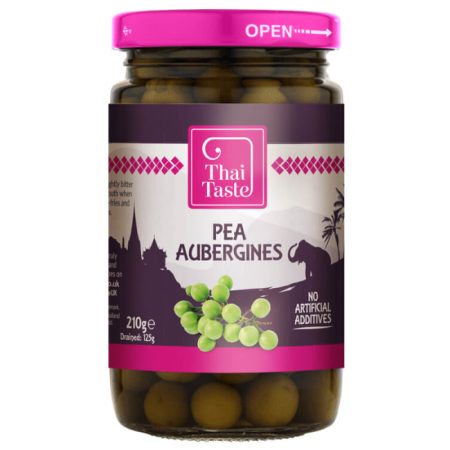 6 x 210g jarsA classic ingredient in Thai cuisine, pea aubergines have a slightly bitter flavour and a unique texture that bursts satisfyingly in the mouth when eaten.