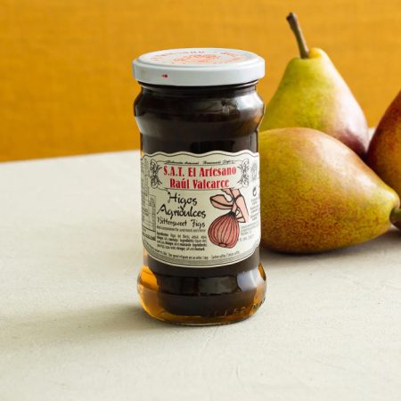 These figs are picked underripe and green, whilst still firm, they are then put into a marinade of vinegar, sugar and spices. The result is a sweet/sharp fruit that makes a delicious accompaniment to hard cheeses or many kinds of cured charcuterie.