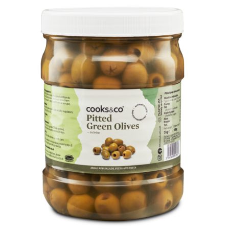 3 x 1kg plastic jarsGreen pitted Olives in brine. Ready to be used in cooking, to garnish a Martini or served as a table snack. Perfect when sliced for topping a pizza, adding to a puttanesca sauce, tossed through a salad or blitzing to make a tapenade.