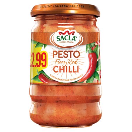 6 x 190g jarsFiery Chilli Pesto simply combines garlic, oil and hot chillies. Sacla have also added red peppers and juicy ripe tomatoes.