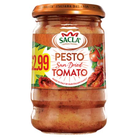 6 x 190g jarsSacla blend tomatoes with fresh basil, glorious Grana Padano cheese and pine nuts. The sweet and satisfying taste of our Sun-Dried Tomato Pesto is perfect paired with chicken kievs, fusilli and chorizo, or even a comforting cottage pie.