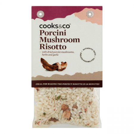 6 x 190g bagsThis Porcini Mushroom risotto uses premium Italian carnaroli rice and its subtle flavour makes it the perfect accompaniment to any meat or fish. Why not serve on its own with a sprinkling of freshly grated Parmesan cheese, for a simple yet tasty dish.