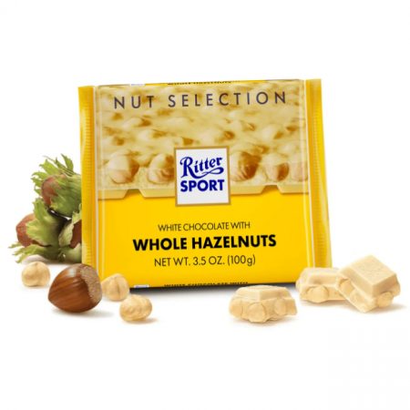 Sugar, Hazelnuts, Cocoa Butter, Whole Milk Powder, Lactose, Rice (2,5 %), Butterfat, Emulsifier (Soya Lecithins), Salt, Barley Malt Extract.