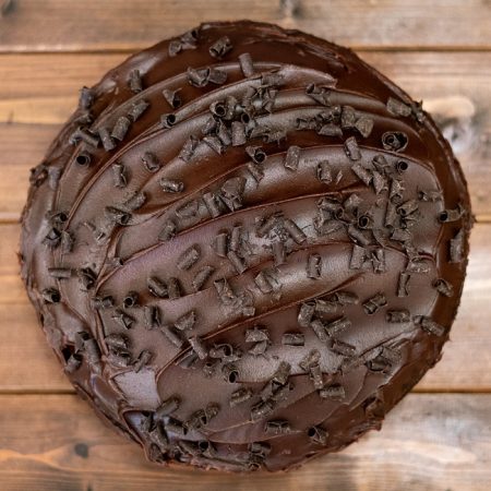 A full flavoured chocolate cake, topped with a chocolate fudge and sprinkled with dark chocolate curls & sweet dusting powder.