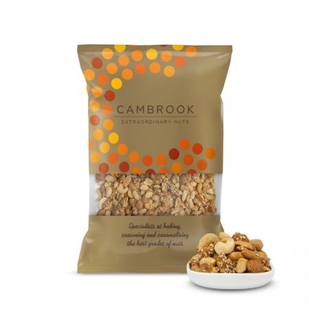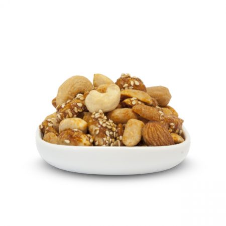 We use a sweet chilli seasoning to coat peanuts and mix them with both baked & salted nuts (cashews, almonds) and caramelised sesame peanuts for another variety in our salted and sweet mixes