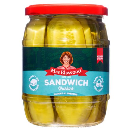 Sandwich Slices pickled cucumber with sweet flavour. Guaranteeing premium quality for over 70 years, Mrs Elswood pickled cucumbers are harvested at the height of the cucumber growing season during June and July every year. Cucumbers are hand-selected for their shape and size before being pickled, packed and delivered, direct from the grower, to maintain freshness and full flavour. The unique flavour and seasonality of Mrs Elswood’s kosher pickled cucumbers makes them a store cupboard essential! Ideal to bring crunch to a sandwich or some twist to a salad.
