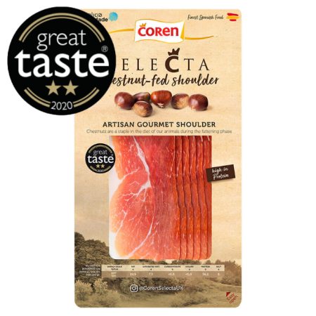 15 x 80g packetsCoren is a cooperative based in Galicia, north-western Spain, and has been producing its Selecta range since 2012. The ham is cured in the traditional way but the pigs feed on chestnuts, giving the ham a slightly sweeter flavour. Paleta is from the front leg or shoulder of the animal, whereas jamon is from the larger hind leg.